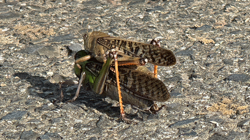 バッタの交尾![]() 陽ざしに暖められたアスファルト敷きの道の上でバッタが交尾をしていた。来春、彼らの子が元気に飛びまわるのだろうと思った。 |